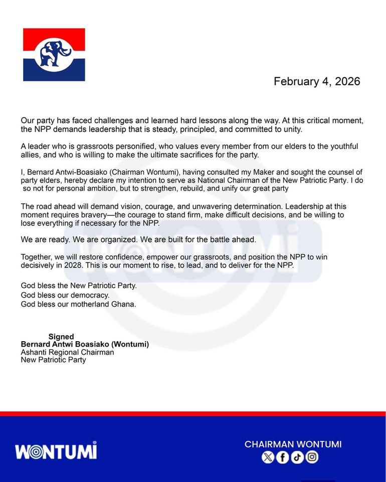 In a statement announcing his decision dated February 4, Chairman Wontumi said the NPP was at a critical moment in its history and required leadership that was firm, principled, and committed to unity following recent electoral setbacks.