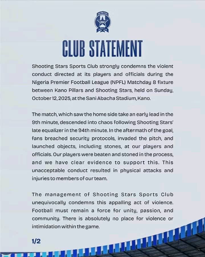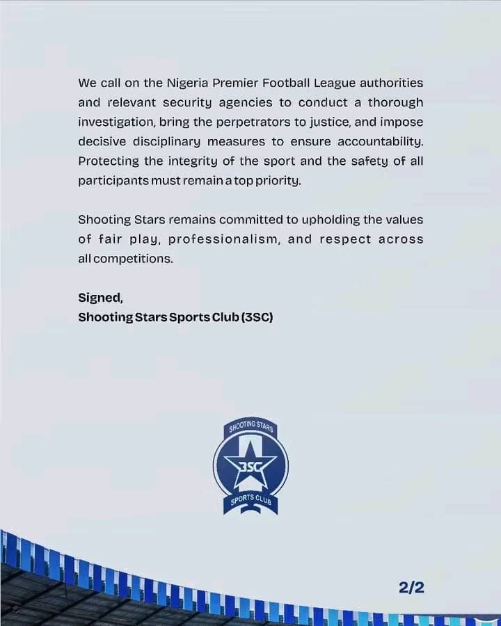 The management of Shooting Stars Sports Club unequivocally condemns this appalling act of violence. Football must remain a force for unity, passion, and community. There is absolutely no place for violence or intimidation within the game