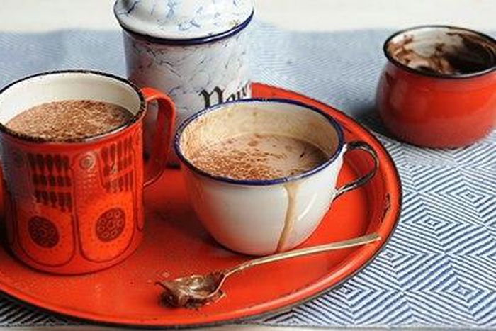 Blend with a stick blender until a light foam forms. Pour and dust with cocoa powder.