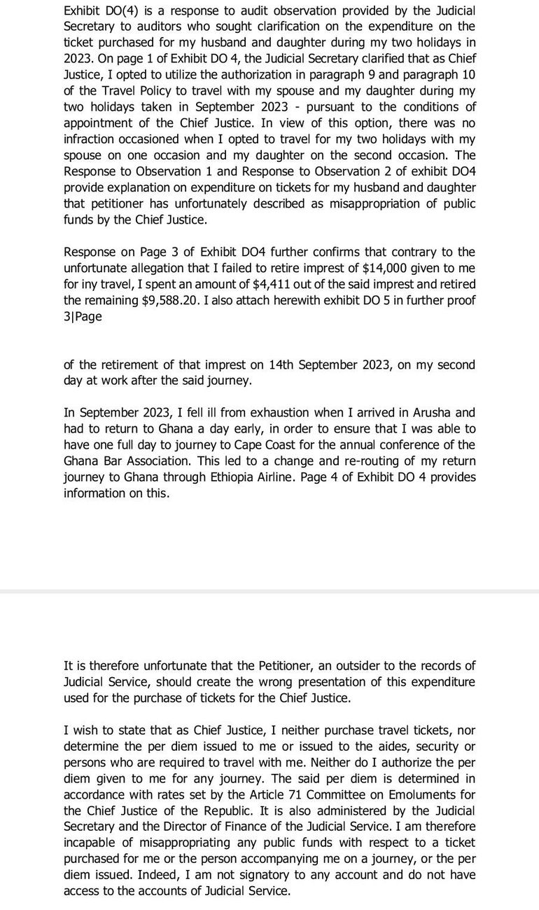 On page 1 of Exhibit DO 4, the Judicial Secretary clarified that, as Chief Justice, I opted to utilise the authorisation in paragraphs 9 and 10 of the Travel Policy to travel with my spouse and daughter during my two holidays in September 2023—pursuant to the conditions of my appointment as Chief Justice.