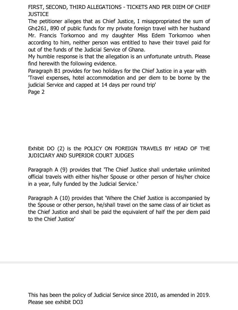 Embattled Chief Justice, Her Ladyship Gertrude Sackey Torkonoo, has defended the payment of travel expenses, accommodation, and per diems for her spouse and daughter by the Judicial Service.
