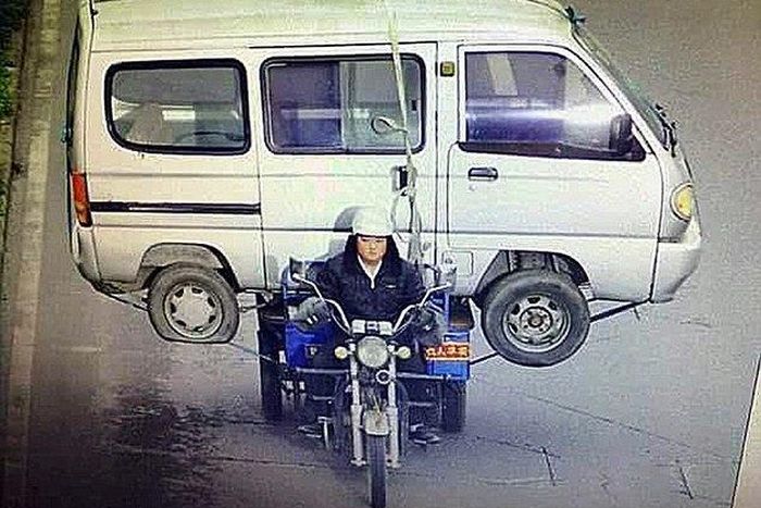 A pretty strong Chinese man has attracted a lot of folks online. He was seen with his scooter carrying a mini-bus at the back. That's pretty strong.