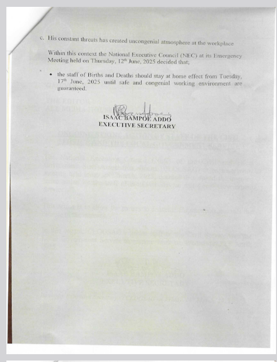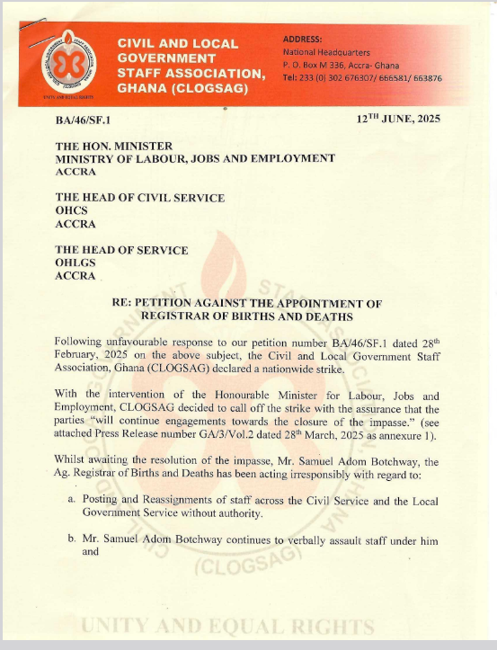 The Civil and Local Government Staff Association, Ghana (CLOGSAG), has instructed all employees of the Births and Deaths Registry across the nation to cease work from Tuesday, June 17, 2025.