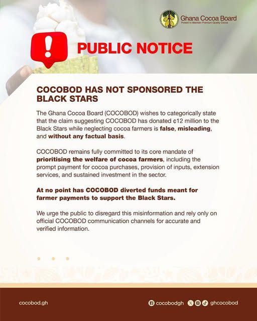 The Ghana Cocoa Board (COCOBOD) has strongly refuted claims that it contributed GHS 12 million to support the Ghana national football team, describing the reports as “false, misleading, and without any factual basis.”