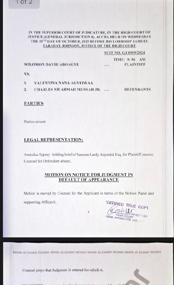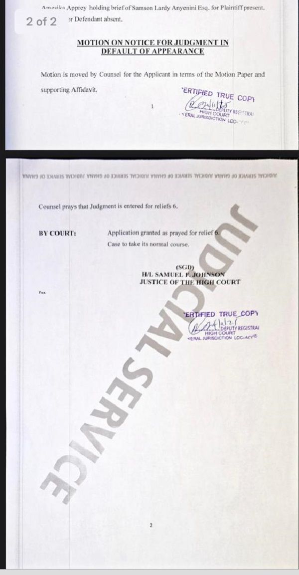 The order was granted after the court upheld an application for default judgment filed by lawyers for the plaintiff. The decision followed the failure of the defendants to enter an appearance or file a defence, despite having been properly served through substituted means in line with court directives issued in 2025.