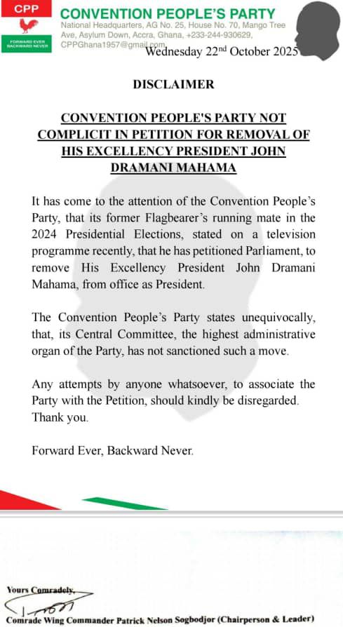 It has come to the attention of the Convention People’s Party that its former flagbearer’s running mate in the 2024 Presidential Elections stated on a television programme recently that he has petitioned Parliament to remove His Excellency President John Dramani Mahama from office as President.