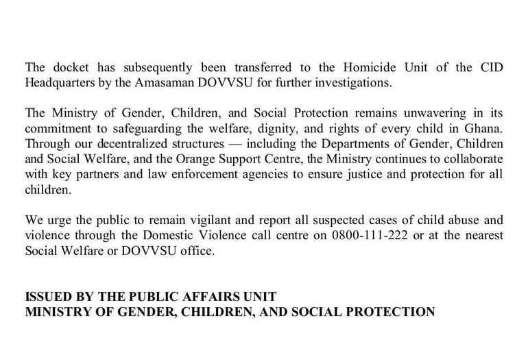 Additionally, the Ministry, through its Orange Support Centre (OSC) under the Domestic Violence Secretariat, has been working closely with the Amasaman Domestic Violence and Victim Support Unit (DOVVSU). The case has since been referred to the Greater Accra Regional DOVVSU for further investigation.