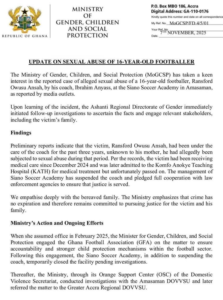 The Ministry of Gender, Children and Social Protection (MoGCSP) has pledged to ensure that justice is served for the late Ransford Owusu Ansah, a 16-year-old footballer who was allegedly subjected to years of sexual abuse by his coach, Ibrahim Anyass, at Saino Soccer Academy.