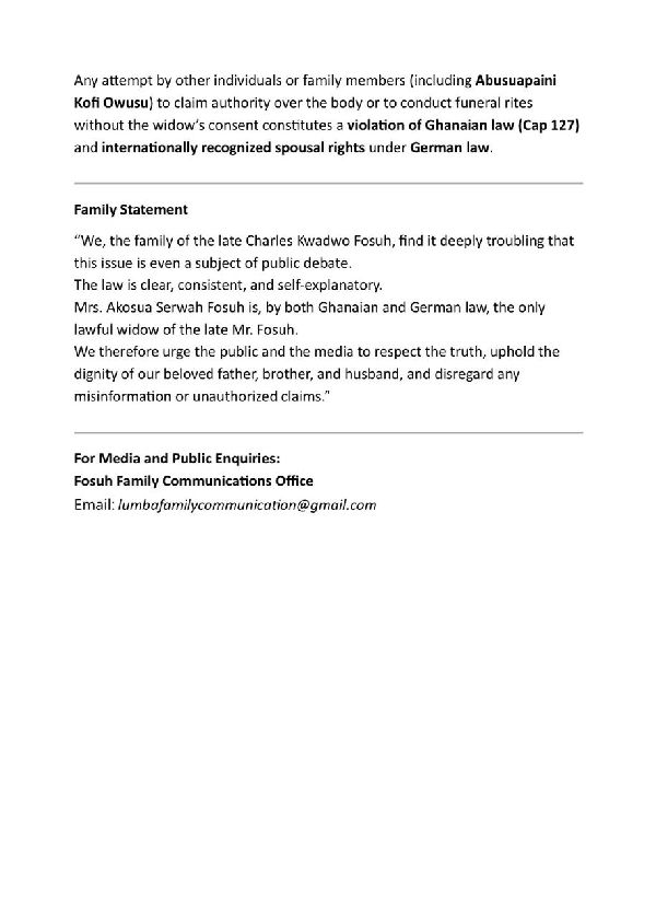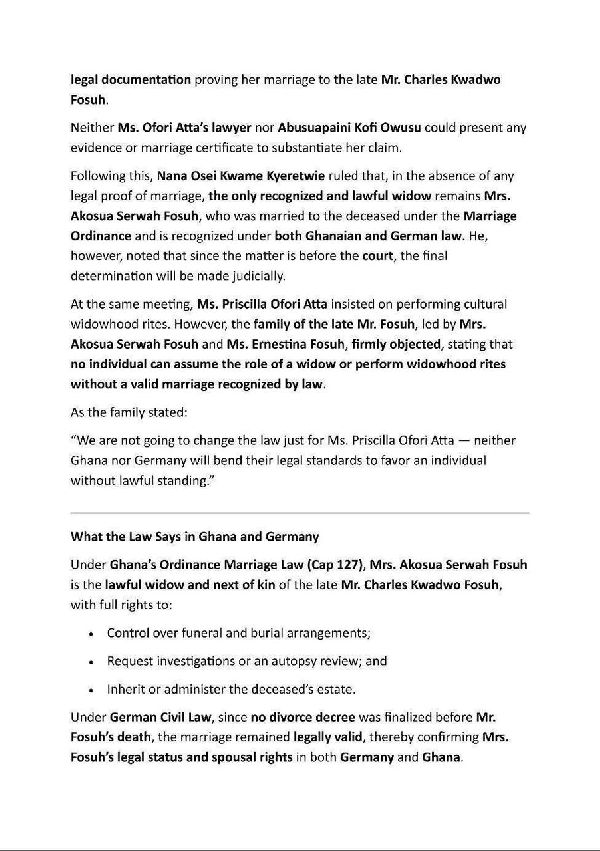 “At the same meeting, Priscilla Ofori Atta insisted on performing cultural widowhood rites. However, the family of the late Mr Fosuh, led by Mrs Akosua Serwah Fosuh and Ms Ernestina Fosuh, firmly objected, stating that no individual can assume the role of a widow or perform widowhood rites without a valid marriage recognised by law,” the statement added.