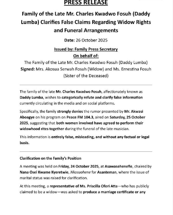 “The family of the late Charles Kwadwo Fosuh, affectionately known as Daddy Lumba, wishes to categorically refute and clarify false information currently circulating in the media and on social platforms. Specifically, the family strongly denies the rumour presented by Akwasi Aboagye on his programme on Peace FM 104.3, aired on Saturday, October 25, 2025, suggesting that both women involved have agreed to perform their widowhood rites together during the funeral of the late musician. This information is entirely false, misleading, and without any factual or legal basis,” the statement read.