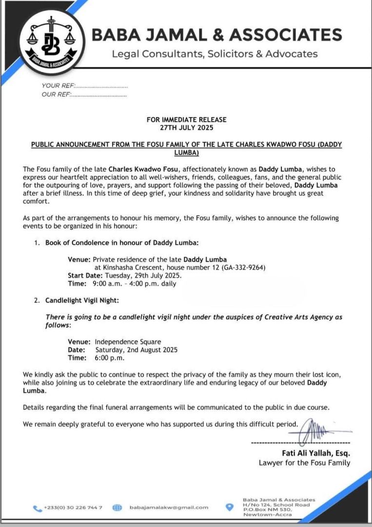 In a statement dated 27th July and signed by their lawyer, the family expressed their heartfelt appreciation to all well-wishers, friends, colleagues, fans and the general public for the outpouring of love, prayers and support following the passing of their beloved Daddy Lumba.