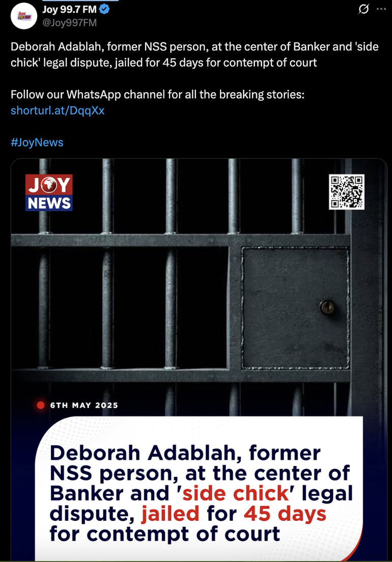 Deborah Seyram Adablah, the former National Service personnel who made headlines for her legal battle against a top banking executive, is to spend the next 45 days in prison following her reported imprisonment for contempt of court.