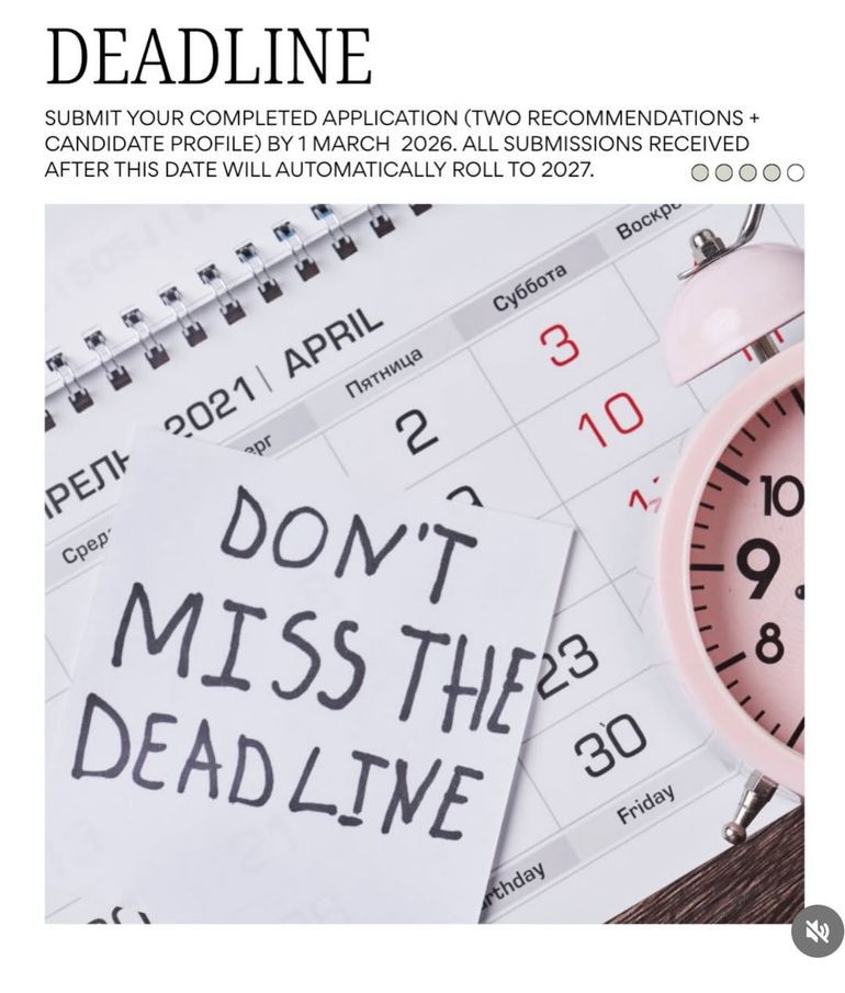 All components of the application, including endorsements and the candidate profile, must be finalised by 1 March 2026. Any submissions completed after the deadline will automatically be deferred to the 2027 review cycle.