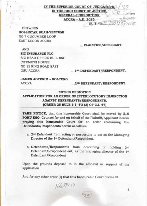 The recently dismissed Managing Director of SIC Insurance Company Limited, Hollistar Duah-Yentumi, has filed an interlocutory injunction to prevent the newly appointed acting Managing Director, James Agyenim-Boateng, from assuming office.