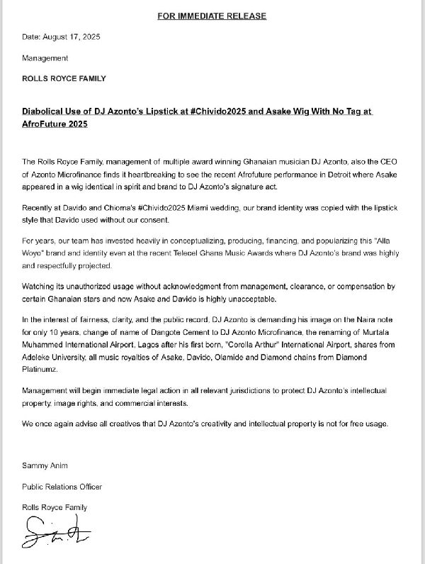The Rolls Royce Family stressed that it intends to pursue legal action across multiple jurisdictions to safeguard DJ Azonto’s intellectual property, image rights, and commercial interests.