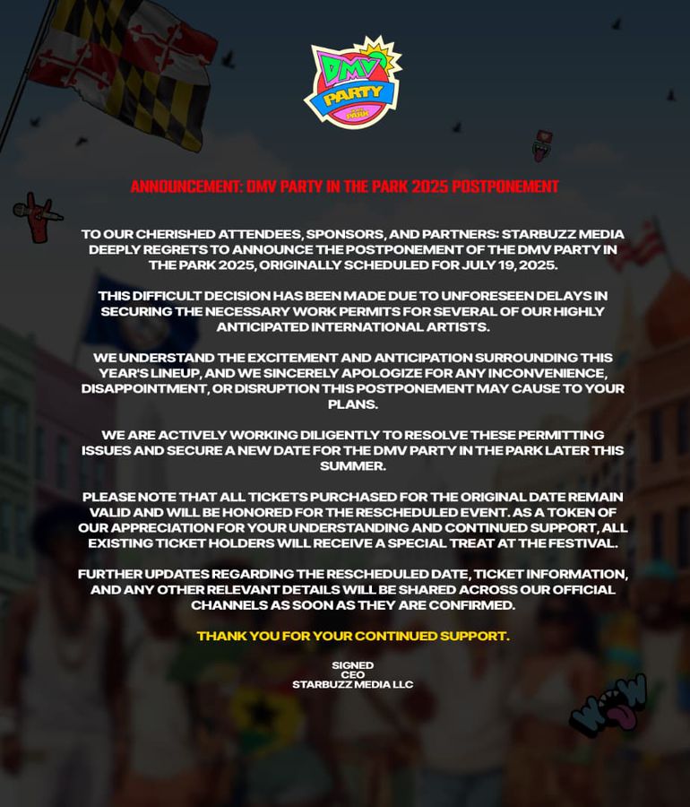 “We understand the excitement and energy that surrounds the DMV Party In The Park each year, and this decision was not made lightly,” said the CEO of Starbuzz Media. “We sincerely apologize for any inconvenience or disappointment caused by this postponement.”