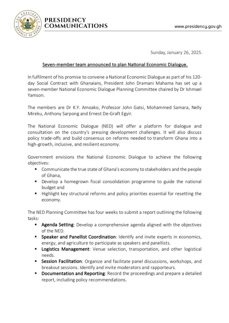 President John Mahama has constituted a seven-member committee to oversee the organisation of the National Economic Dialogue (NED) within four weeks. The planning committee, chaired by Dr Ishmael Yamson, is in fulfilment of the President’s 120-day promise as part of efforts to revitalise the Ghanaian economy.