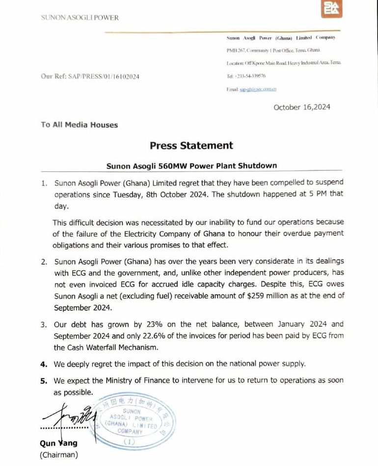Sunon Asogli Power (Ghana) Limited regrets that they have been compelled to suspend operations since Tuesday, 8th October 2024. The shutdown happened at 5 PM that day.