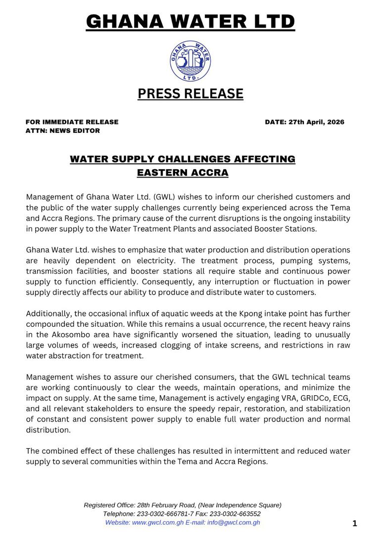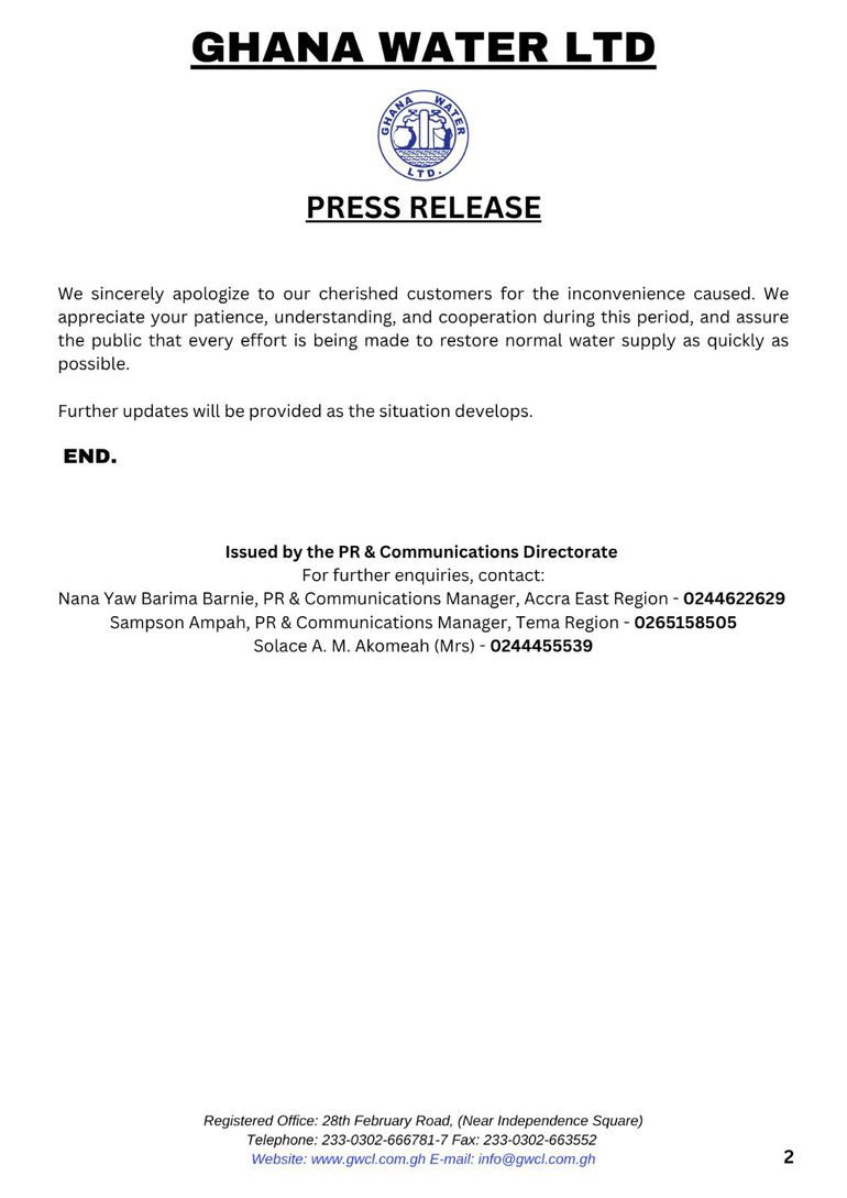 GWL is working with Volta River Authority, GRIDCo, and Electricity Company of Ghana to restore stable power and normal water supply.