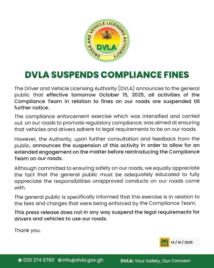 The Driver and Vehicle Licensing Authority (DVLA) has officially suspended all fines and penalties imposed by its Compliance Team nationwide. The suspension takes effect from Wednesday, October 15, 2025, and will remain in force until further notice.