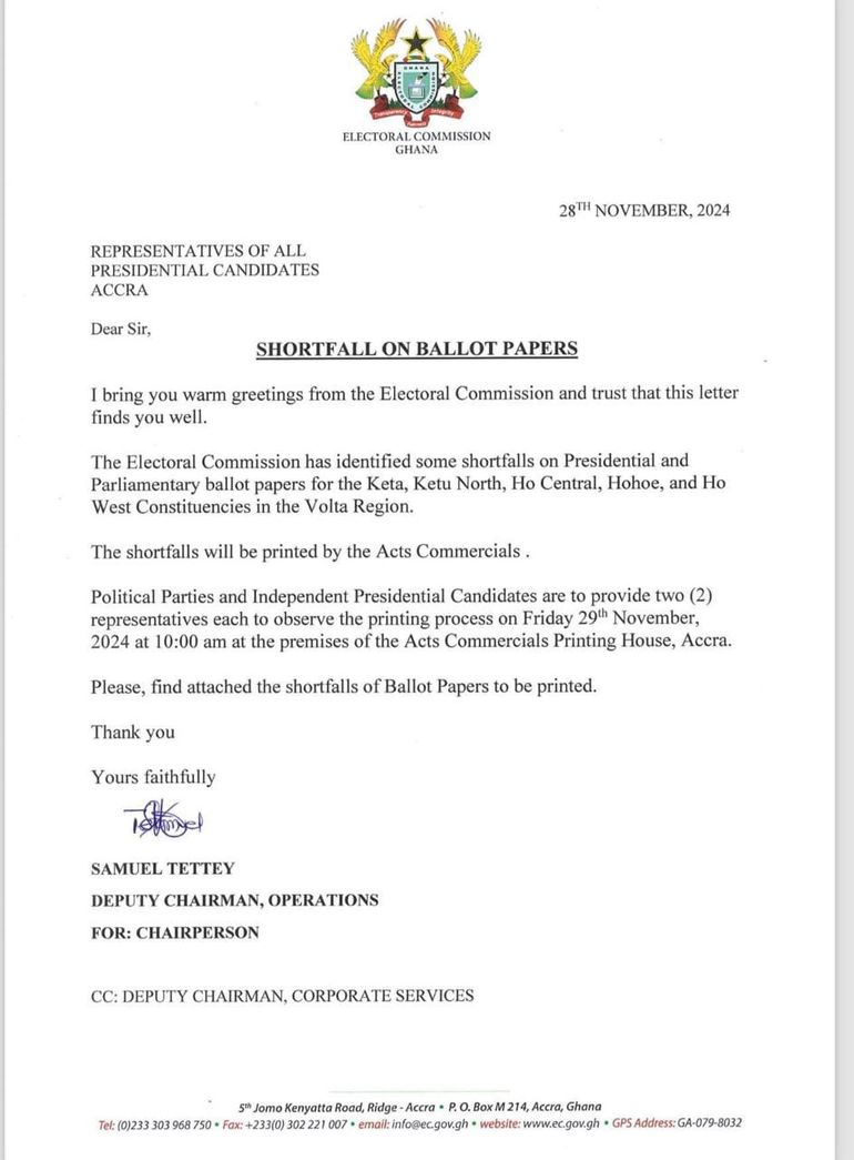 Following the release of the letter titled, 'SHORTFALL ON BALLOT PAPERS' by the Electoral Commission of Ghana, we have engaged our dedicated #EAGLEEYES team that observed the printing and bagging process at Acts Commercial printing house. The brief from our team makes it abundantly clear that the Electoral Commission of Ghana has committed another avoidable error. Our agents make it clear to us that the ballot statistics submitted to Acts Commercial (printing house) were complied with.