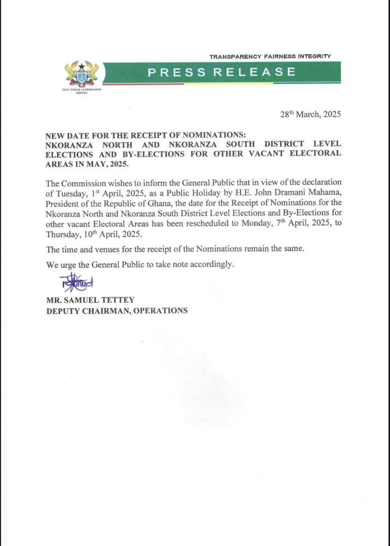 The Commission wishes to inform the general public that, in view of the declaration of Tuesday, 1st April 2025, as a public holiday by H.E. John Dramani Mahama, President of the Republic of Ghana, the date for the Nkoranza North and Nkoranza South District Level Elections and By-Elections for other vacant electoral areas has been rescheduled to Monday, 7th April 2025, to Thursday, 10th April 2025.