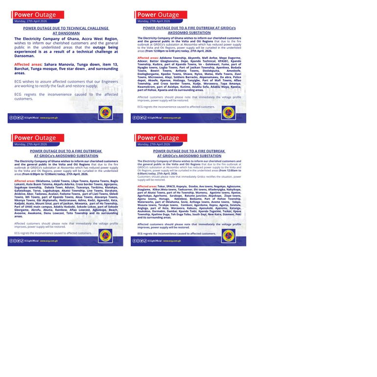 In a series of public notices issued on April 27, 2026, ECG said the outages in the Volta and Oti Regions are linked to a fire incident at a substation operated by the Ghana Grid Company Limited at Akosombo.
