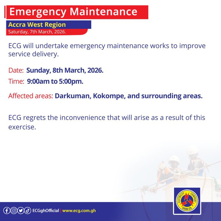 The ECG explained that the planned maintenance forms part of ongoing efforts to improve service reliability and strengthen the power distribution infrastructure in the affected areas.