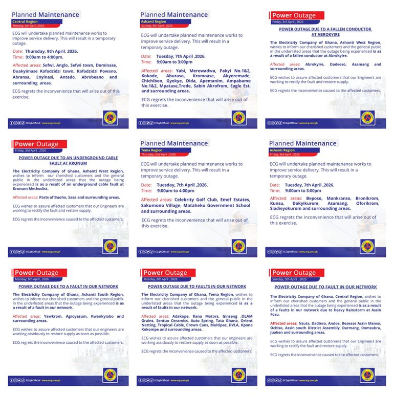 The Electricity Company of Ghana (ECG) has announced a series of power outages scheduled to take place across parts of the Ashanti, Central and Tema regions between April 7 and April 9.