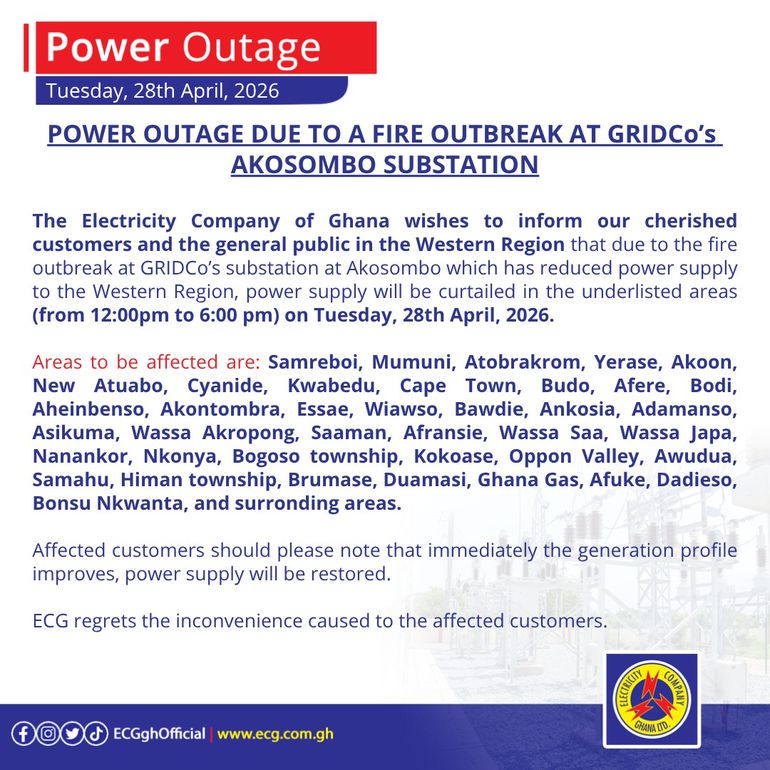 The Electricity Company of Ghana (ECG) has announced scheduled and unplanned power outages affecting parts of Western Region, following a fire outbreak at Akosombo.