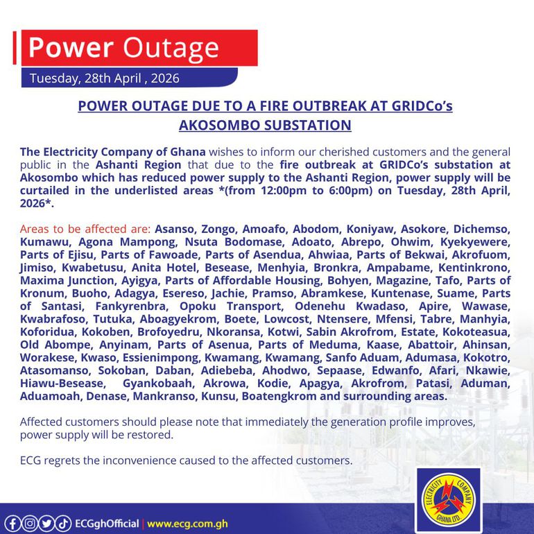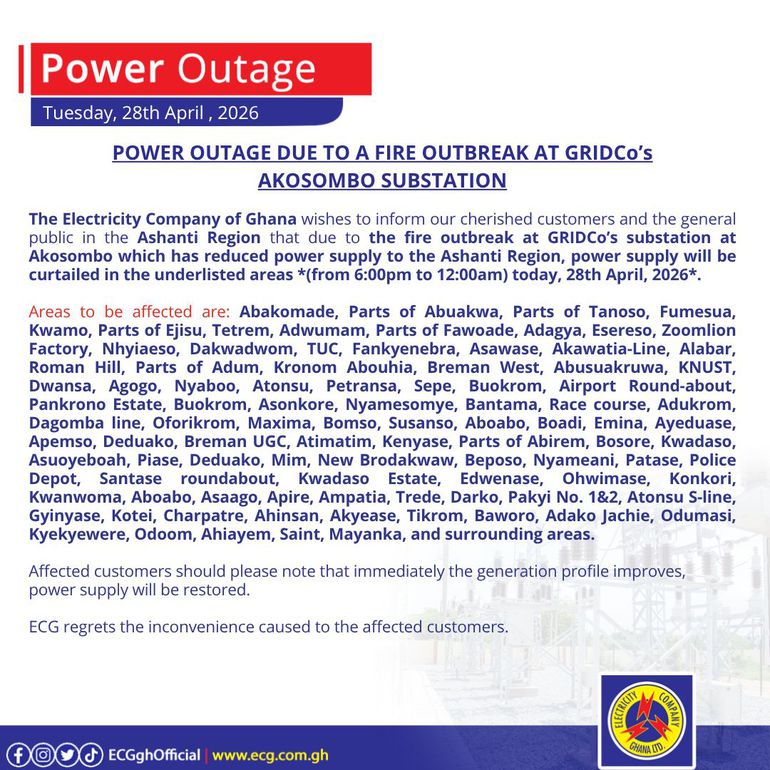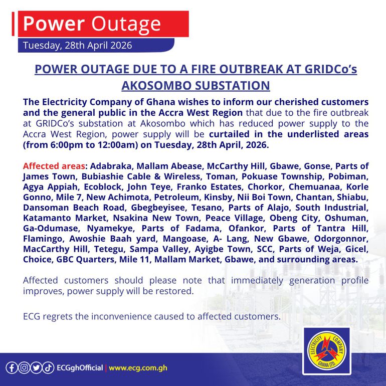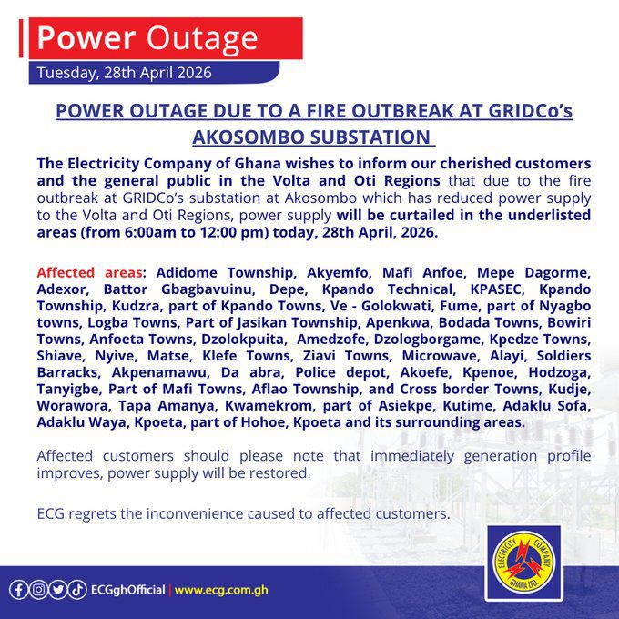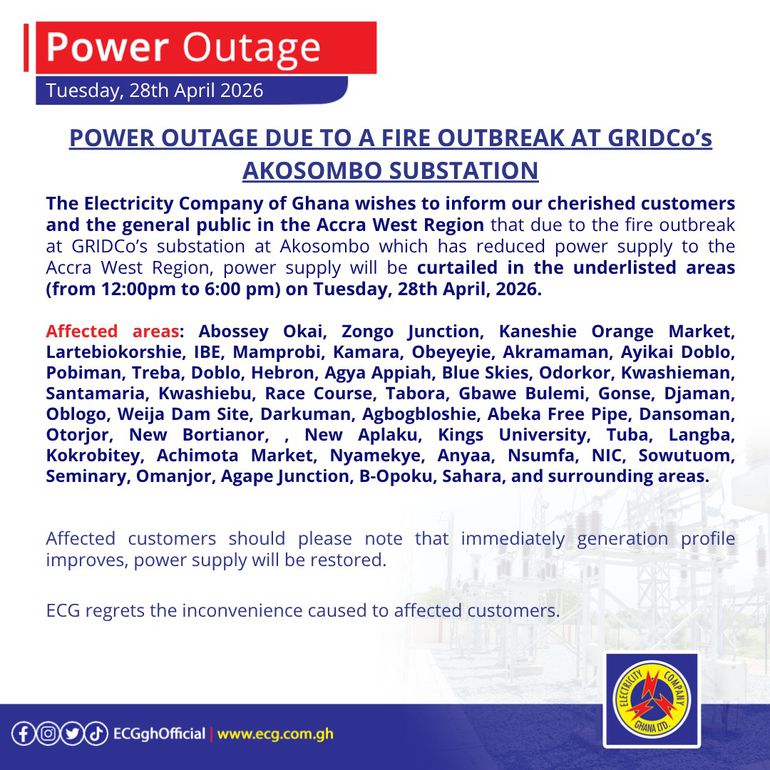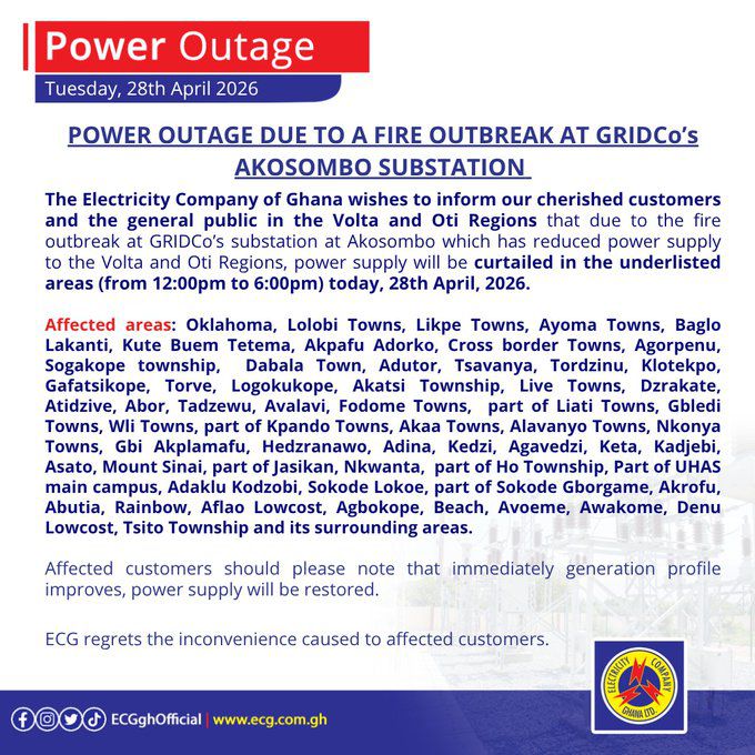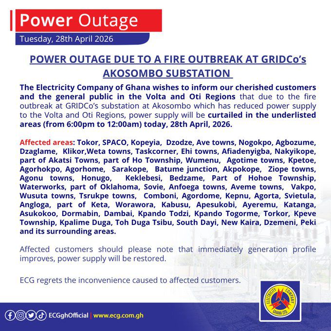 In a series of public notices issued on April 28, 2026, ECG said the outages are linked to a fire incident at a substation operated by the Ghana Grid Company Limited at Akosombo.