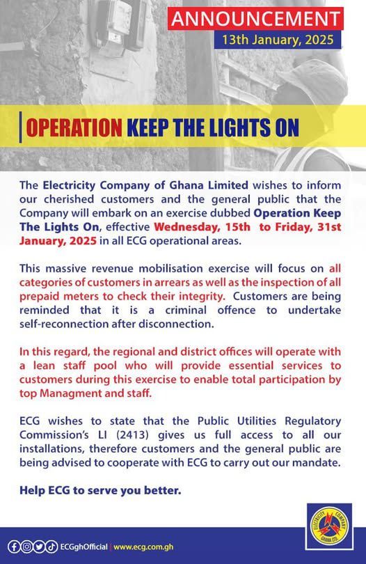 The Electricity Company of Ghana (ECG) has launched an initiative dubbed ‘Operation Keep the Lights On’ as part of its efforts to enhance revenue collection. The exercise will run from Wednesday, 15th January, to Friday, 31st January 2025, across all ECG operational areas.