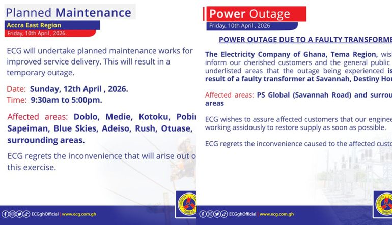 In addition to the fault-related outage, ECG has also announced a scheduled power interruption on Sunday, April 12, 2026, as part of ongoing maintenance works aimed at improving service delivery.