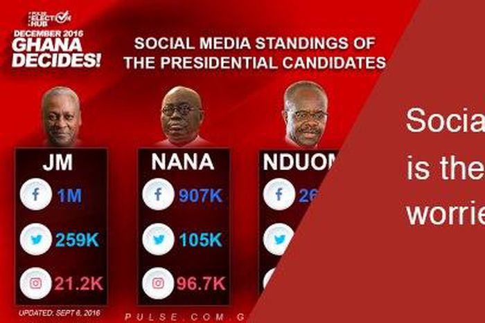 Currently, on Facebook, the presidential nominee with most followers is President Mahama, followed by Nana Akuffo Addo and Dr Papa Kwesi Nduom.