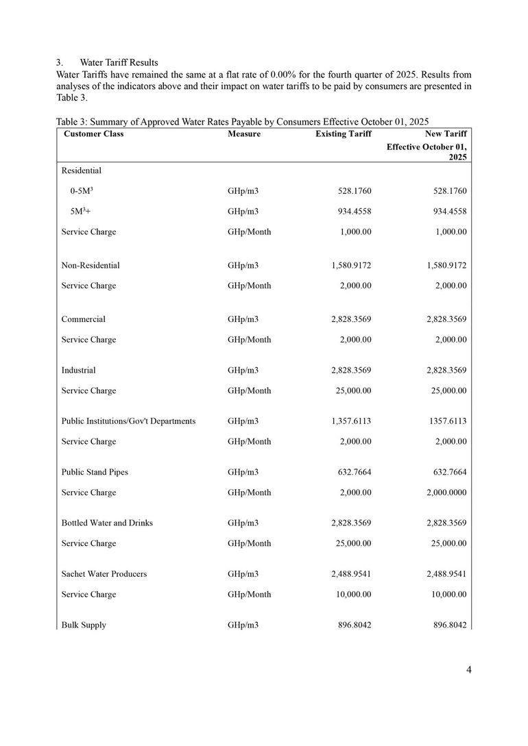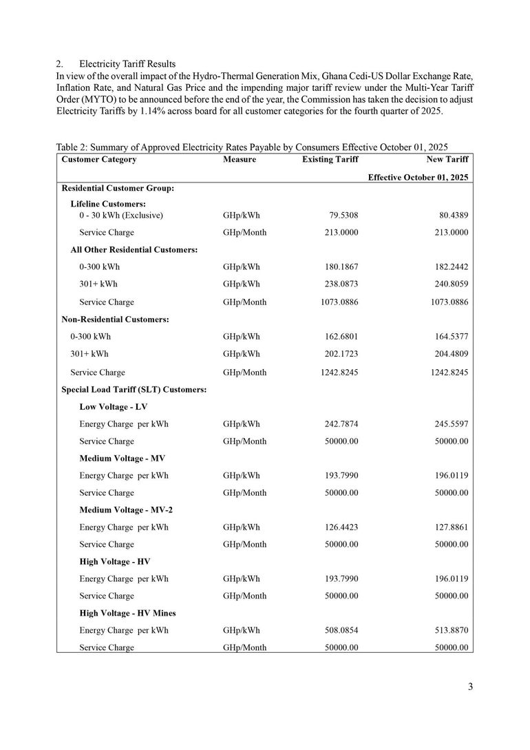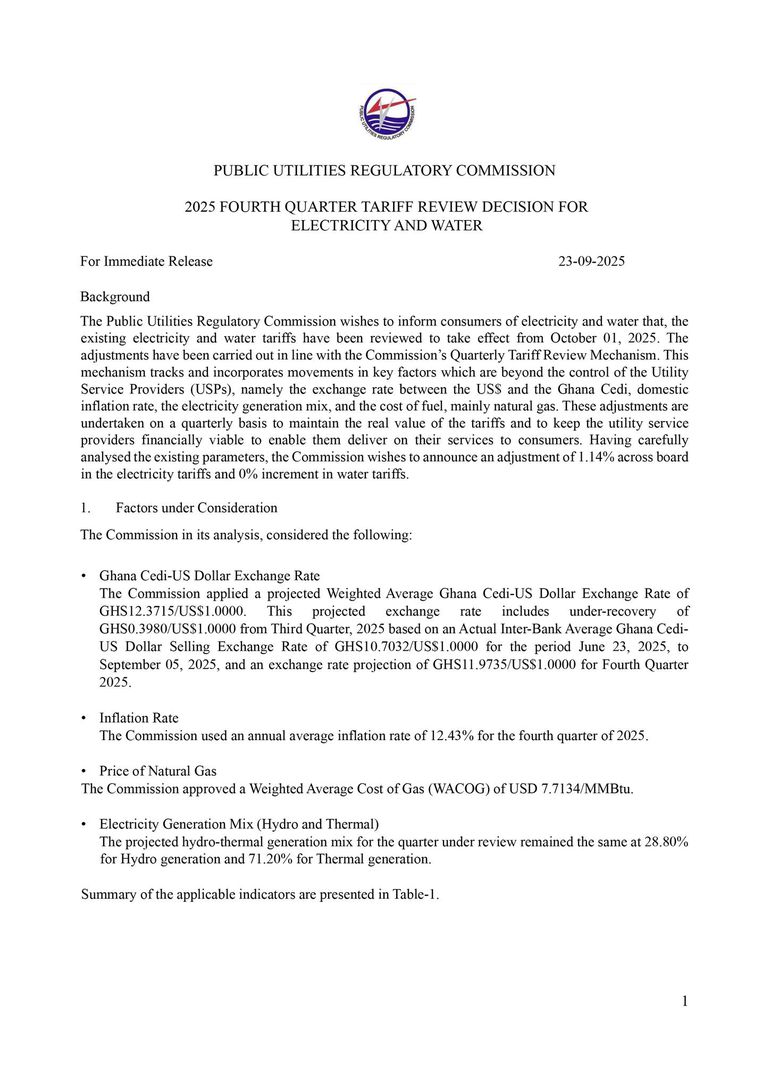 Consumers of electricity nationwide will see a marginal increase in tariffs from 1 October 2025, following the latest quarterly adjustment announced by the Public Utilities Regulatory Commission (PURC). The Commission has approved a 1.14% upward adjustment in electricity tariffs across all categories, while water tariffs remain unchanged for the fourth quarter of the year.