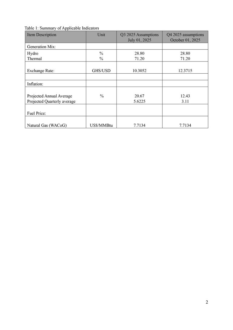Exchange Rate: PURC applied a projected weighted average Ghana Cedi–US Dollar exchange rate of GHS12.3715 to US$1. This figure incorporates an under-recovery of GHS0.3980 from the third quarter, based on the actual interbank average rate of GHS10.7032 between 23 June and 5 September 2025, and a projected rate of GHS11.9735 for the fourth quarter.