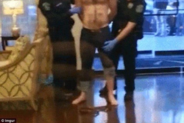 The topless man stands in the reception of an office as police carry out their job and pat him down to check for weapons.