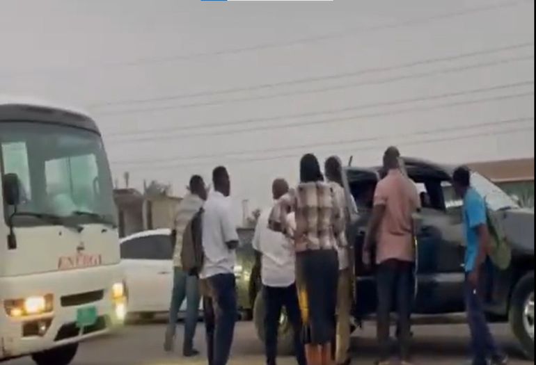 The incident reportedly occurred at Kasoa Amanfrom on the morning of Thursday, 15 January 2026. Video footage shared by 1957News shows staff of the Energy Ministry, travelling from Kasoa to the office on an official bus, encountering a pickup truck parked in the middle of the road, obstructing the bus’s exit onto the main road.