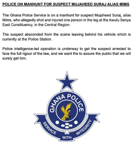 The Ghana Police Service has initiated a manhunt for a suspect, Mujaheed Suraj, also known as Mims, in connection with a shooting incident in the Awutu Senya East Constituency, located in the Central Region.