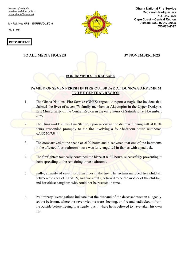 The Ghana National Fire Service (GNFS) has confirmed the deaths of seven (7) family members following a suspected arson attack at Akyempim in the Upper Denkyira East Municipality of the Central Region.