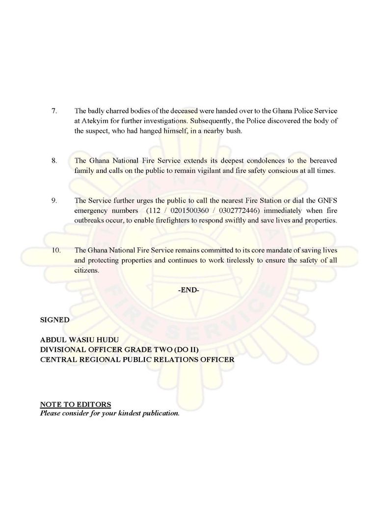 The statement further noted that the charred bodies of the victims have been handed over to the Ghana Police Service at Atekyim for further investigation.