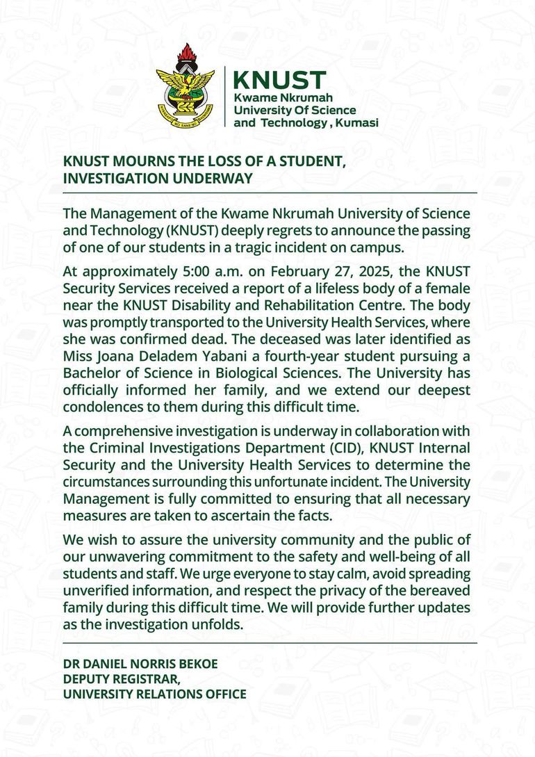 The Kwame Nkrumah University of Science and Technology (KNUST) has confirmed the tragic passing of a final-year female student and has commenced an immediate investigation to determine the cause of her death.