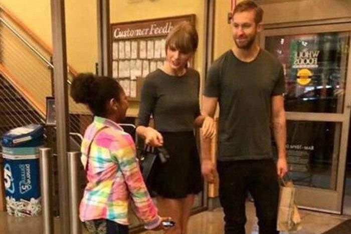 Taylor and Calvin totally mirrored each other in color-coordinating looks as they made their way out of the store, stopping to talk to a fan that approached Taylor. They might have been hoping to fly under the radar, but seeing those endless legs in a skater skirt totally gave it away as they stood quite close to each other.
