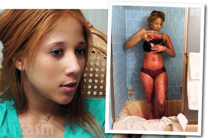 A 19-year-old model in California has taken to bathing in pig's blood in a desperate attempt to maintain her youthful appearance.