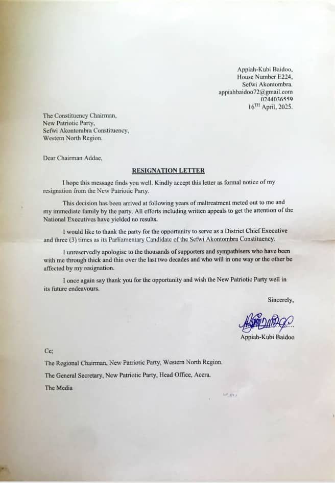 A former parliamentary candidate of the opposition New Patriotic Party (NPP) in the Sefwi Akontombra Constituency, Appiah-Kubi Baidoo, has resigned from the party.