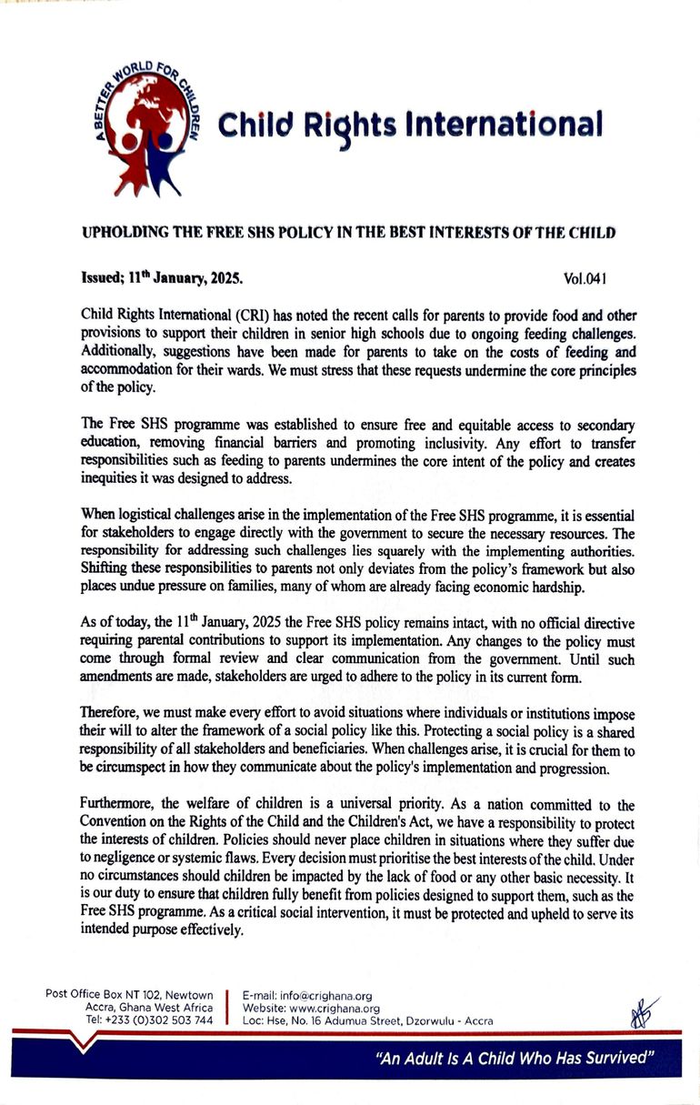 A Non-Governmental Organisation (NGO), Child Rights International, has raised concerns over suggestions that parents should bear the responsibility of feeding their wards under the Free Senior High School (SHS) policy.