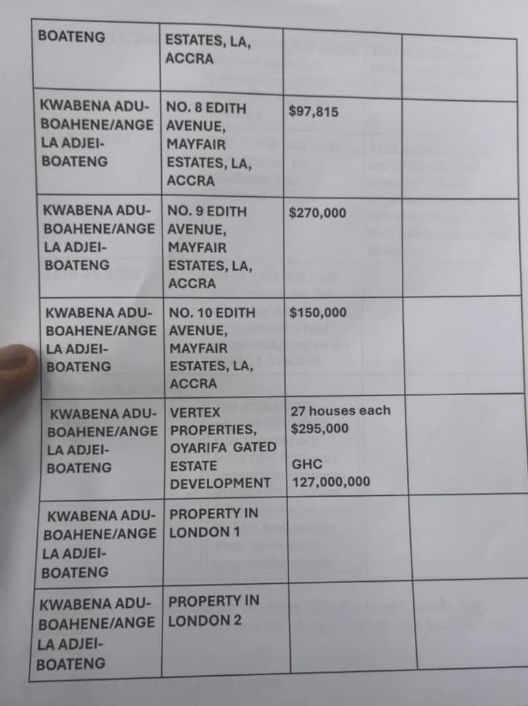 The Attorney-General, Dr Dominic Ayine, has disclosed a list of properties owned by the embattled former Director-General of the National Signals Bureau (NSB), Kwabena Adu Boahene, and his wife, Angela Adjei-Boateng.