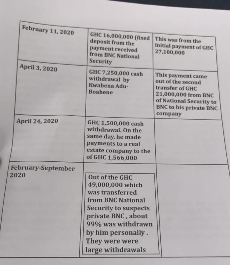 A review of the transactions on the private BNC account reveals that after the payment of GH₵9,537,520, Mr Adu Boahene and his wife began using the remaining funds for personal expenses, making transfers to local third parties, personal investments, and unidentified recipients.
