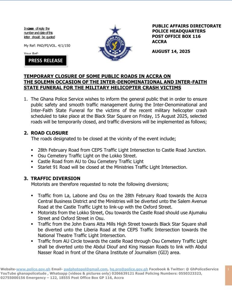 The Ghana Police Service has released a list of road closures and traffic diversions ahead of the Inter-Denominational and Inter-Faith State Funeral in Accra on Friday, August 15, for the eight (8) individuals who lost their lives in the tragic military helicopter crash at Adansi Akrofuom on Wednesday, 6 August.