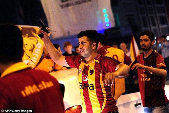 The fan, fully fitted in Galatasaray's strip was seen waving a gun as he celebrated.